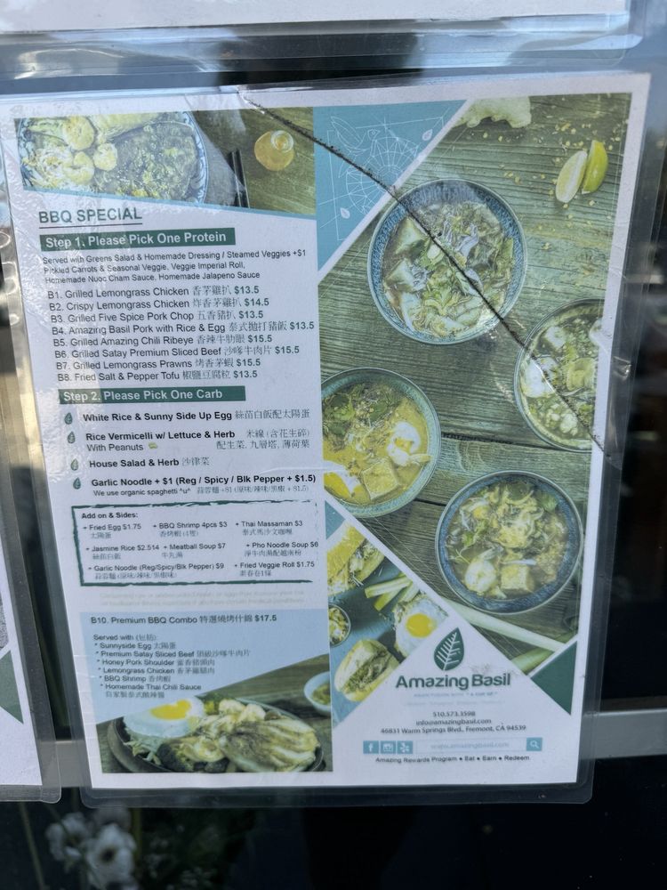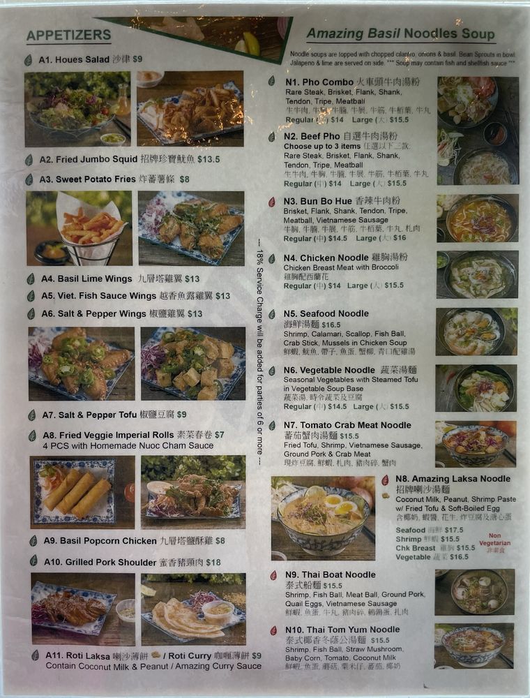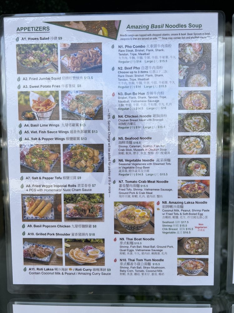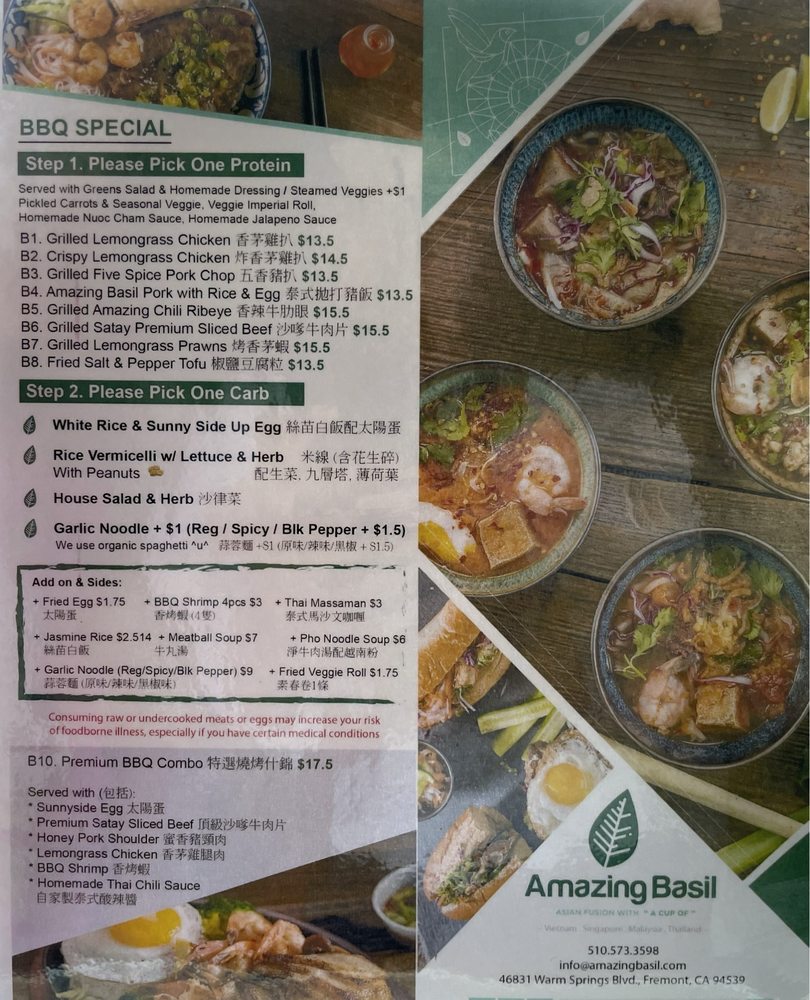 Introducing Amazing Basil, a trendy Asian Fusion restaurant in Fremont, CA, offering a delightful blend of Thai and Vietnamese cuisine. The menu features vegan and vegetarian options, with standout dishes like the Papaya Salad, Roti dishes, and Shrimp Laksa Noodle. Customers rave about the flavorful Roti Curry and crispy Shrimp Crackers. The cozy ambiance and attentive staff create a welcoming dining experience. While some reviewers noted issues with spice levels and service, the overall consensus is positive, with compliments on the clean decor and diverse menu selection. If you're looking for a unique dining experience with bold flavors and a chic atmosphere, Amazing Basil is a must-try spot for lunch, dinner, or special occasions.